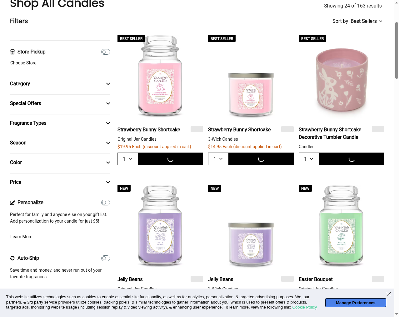 Yankee Candle is the world's best-known premium candle brand, drawing over 3.1 million monthly visits to its ecommerce site. The catalog spans 150+ signature fragrances across original jar candles, tumblers, wax melts, car fresheners, and seasonal limited editions — each with detailed burn times, size variants, and customer ratings.